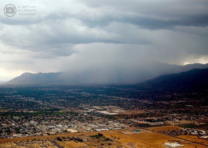 A cloudburst hovers over the Sandia Mountains in Albuquerque, New Mexico.
