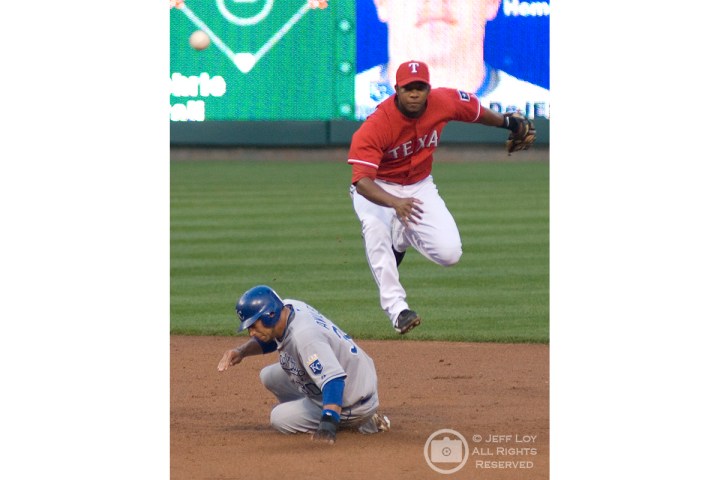 Texas Rangers shortstop Elvis Andrus attempts to turn a double play after tagging Kansas City’s Mike Aviles.