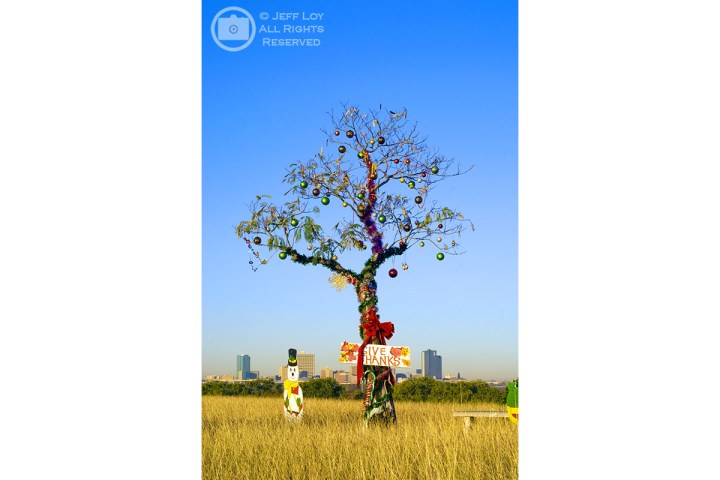 The Homeless Christmas Tree, which used to stand along I-30 in Fort Worth, Texas. First decorated in the mid 1980s, the tree evolved into a reminder of the homeless during the holidays and was the inspiration for a children’s book.