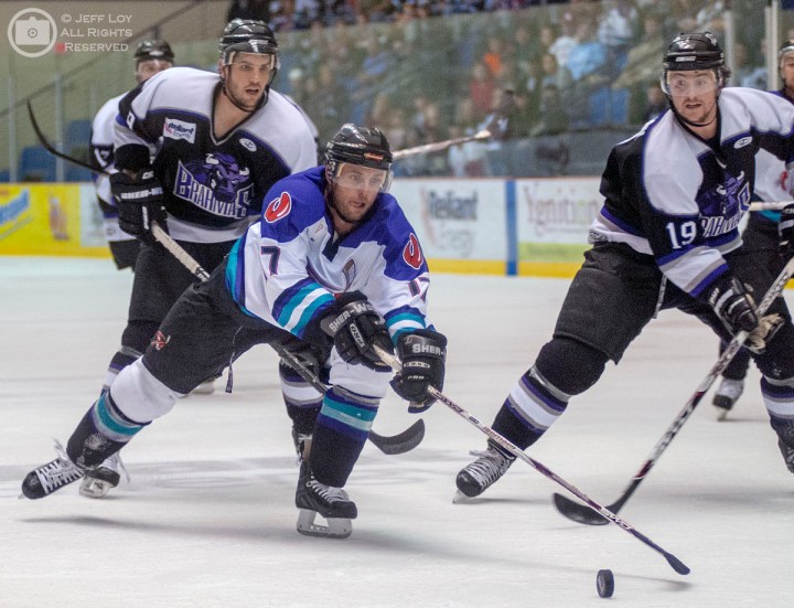 Shreveport Mudbugs defenseman Ryan Fairbarn tries to beat Texas Brahmas forwards Grant Jacobsen (left) and Jordan Cameron to the puck at NYTEX Sports Centre in North Richland Hills, Texas.