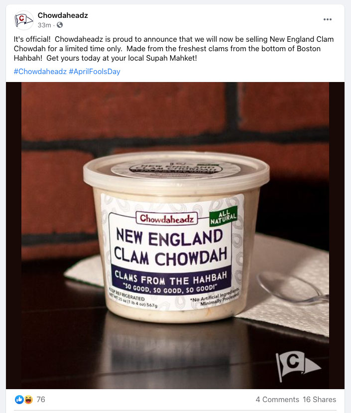 Massachusetts-themed apparel maker Chowdaheadz introduced, well, chowder, on April 1. It promised only the best clams from the bottom of Boston Harbor, prompting at least one response of “I wouldn’t eat anything out of the hahbah”.