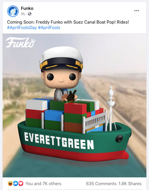 While Funko is well known for creating collectibles based on pop culture, they decided to take a shot at current events. They “introduced” a new product based on the Evergreen, the boat that became stuck in the Suez Canal, with mascot Freddy Funko at the helm. (They referred to their vessel, though, as the “Everettgreen”).