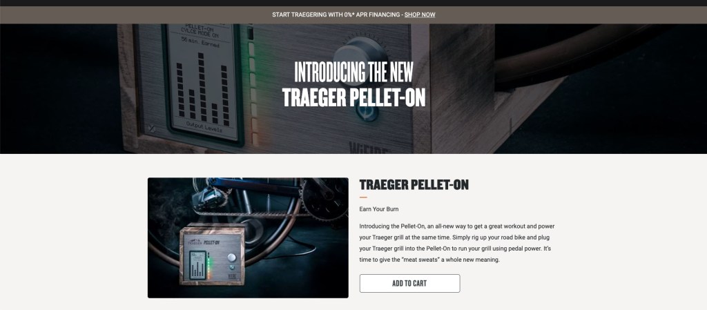 Traeger, whose product line includes pellet-fueled smokers, took on Peloton by introducing the Pellet-On, which allows users to power their smoker with a bicycle. (“Only have time for a quick session? A roast chicken should do the trick. Ready for an all-day ride? Sounds like a good excuse to smoke a whole pork shoulder.”)