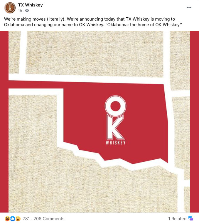 A couple of regional brands took shots at neighboring states as well as themselves. Fort Worth, Texas-based TX Whiskey announced they were moving north to Oklahoma so they could be known as “OK Whiskey”. Their new slogan takes a shot at not only Oklahoma-produced whiskey, but also the old state slogan of “Oklahoma is OK” which for years frustrated Oklahomans and amused Texans.